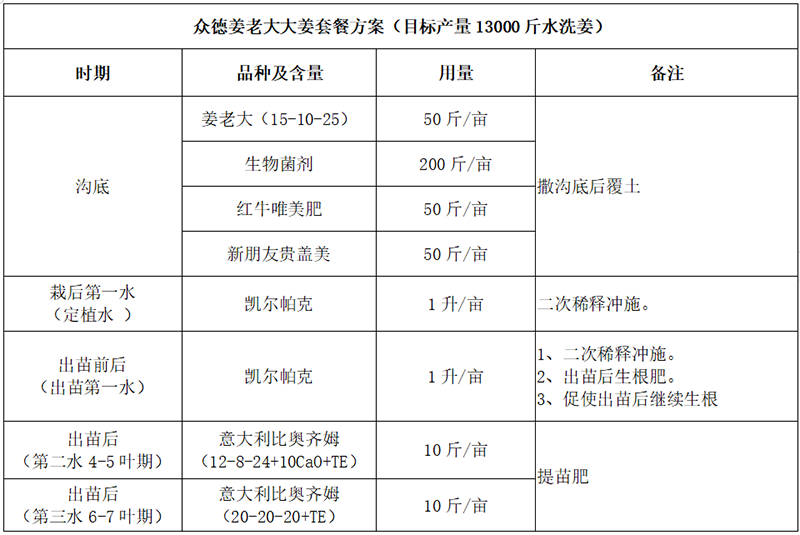 (2)大、中、微量元素兼顧:大姜除對氮磷鉀的需求外,對鈣、鎂需求也很大,中量元素鈣鎂及微量元素應(yīng)早施。