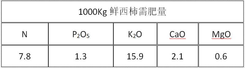每生產(chǎn)1000千克番茄需從土壤中吸收氮7.8千克、P2O5 1.3千克、K2O 15.9千克、 CaO 2.1千克、MgO 0.6千克。